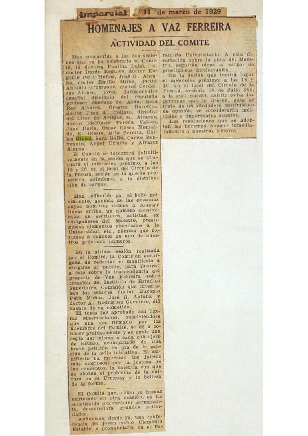 View documentPress clipping from “El Imparcial”, Dated March 11, 1929, stating that Carlos Giucci is a member of the organizing committee for the tribute to Carlos Vaz Ferreira. Location: