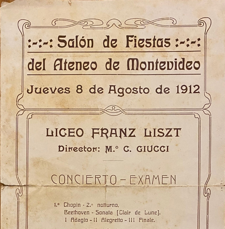 El Liceo Musical Franz Liszt fue fundado en 1895 por Camilo Giucci y Luisa Gallo. Camilo había llegado a Montevideo en 1885, en el marco de una gira de conciertos. En uno de esos conciertos, conoció a Luisa, y contrajeron matrimonio ese mismo año. Hacia fines del siglo XIX, se fundaron en Montevideo algunos centros de enseñanza musical. Se trató de un primer impulso en la consolidación de un sistema de enseñanza musical, protagonizado por conservatorios privados, que eran dirigidos por personalidades relevantes del ambiente musical. Así, en 1873, se fundó la Sociedad Musical, que en 1875 se nombró como Sociedad Musical “La Lira”. En 1890 se fundó el Instituto Verdi, que era dirigido por los hermanos Francisco y Luis Sambucetti. Mientras tanto, en el ámbito público, en 1879 se fundó la Escuela Nacional de Artes y Oficios, que incluyó cursos de música.