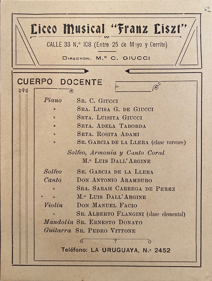 Ver documentoCuerpo de docentes del Liceo Musical Franz Liszt, sin fecha. Figuran Camilo Giucci, Luisa Gallo y Luisa Giucci. Ubicación: Museo Histórico Nacional.