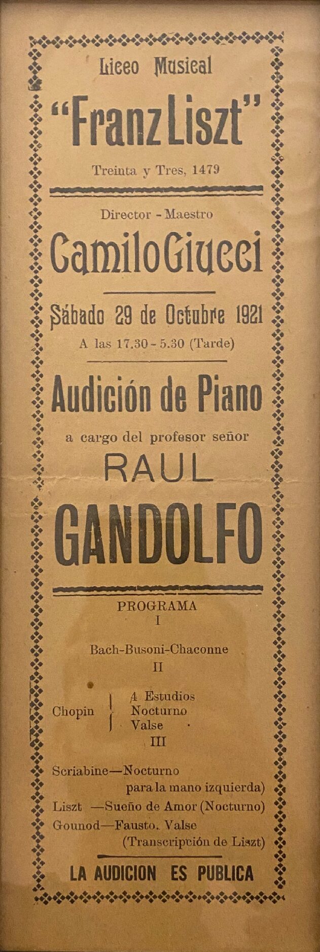 Ver documentoAfiche de concierto de Raúl Gandolfo a realizarse en el Liceo Musical Franz Liszt el 29/10/1921. Detalla programa. Ubicación: Archivo personal Mario Gandolfo.