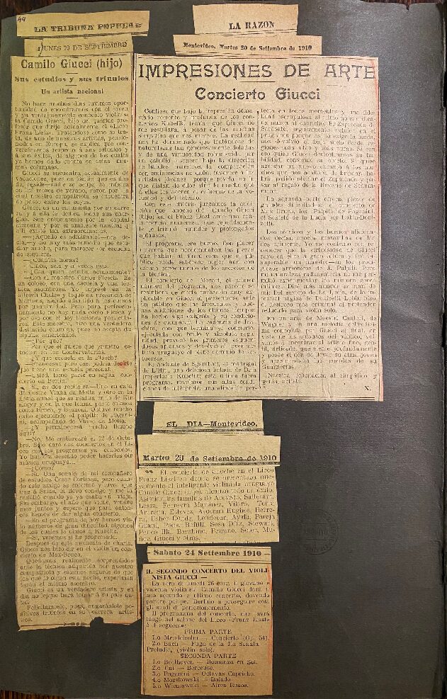 Ver documentoÁlbum de recortes de prensa sobre conciertos de Camilo hijo en Montevideo en 1910. Ubicación: Museo Histórico Nacional.