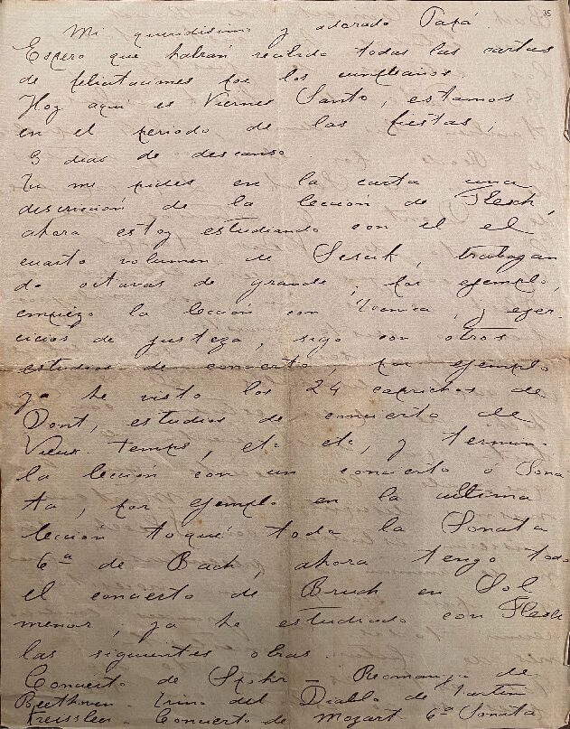 Ver documentoCarta de Camilo (hijo) a su padre, sin fecha, probablemente marzo o abril de 1910. Hace referencia a aprendizaje con Carl Flesch. Ubicación: Museo Histórico Nacional.