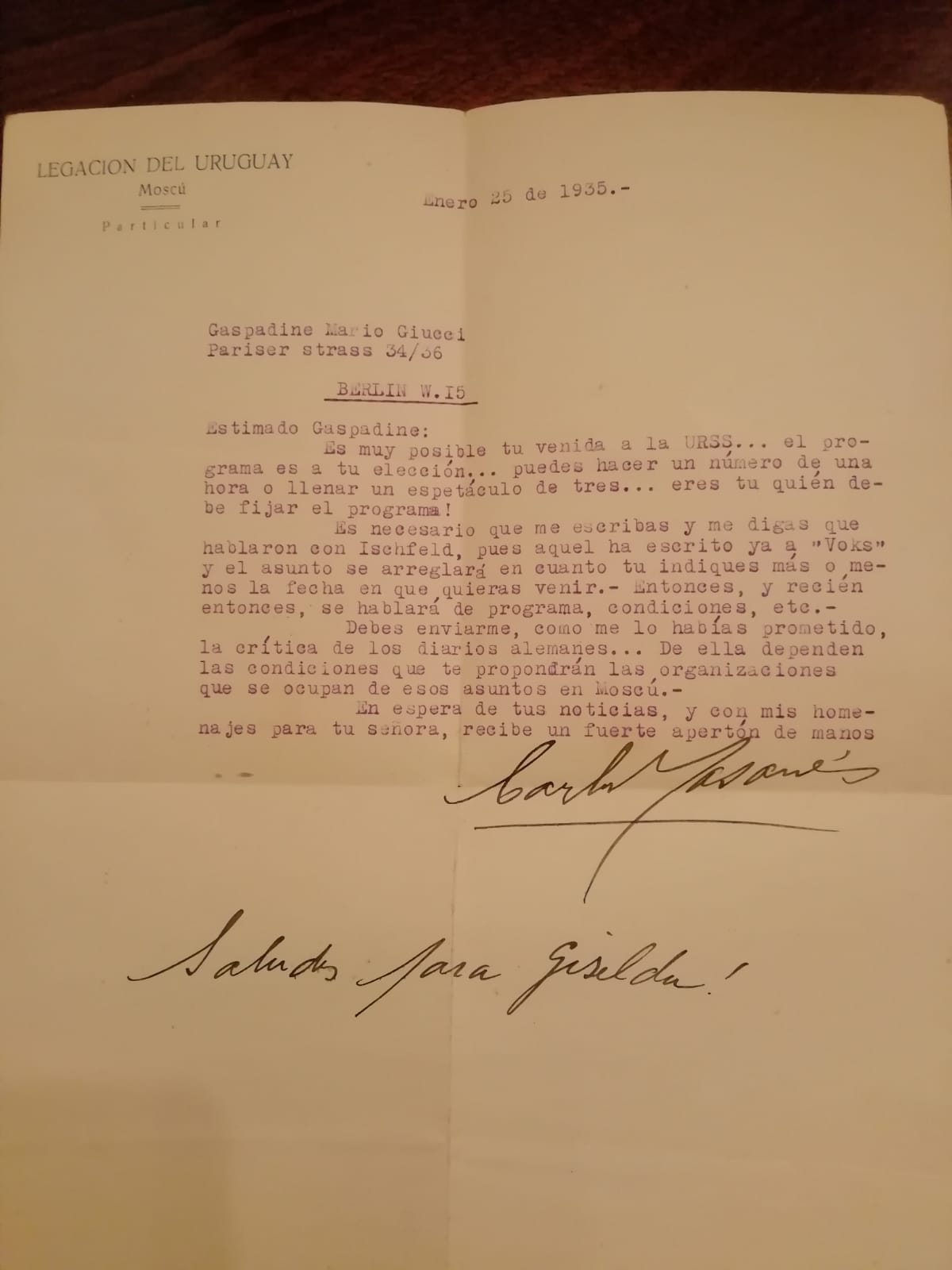 Ver documentoCarta de Carlos Masanes a Mario Giucci, 25/1/1935. Carta con sello de la Legación Uruguaya en Moscú. Refiere a un posible viaje de Mario a la URSS. Ubicación: archivo personal familia Giucci.
