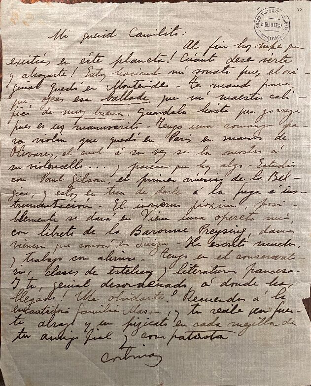 Ver documentoCarta de César Cortinas a Camilo Giucci (hijo), sin fecha. Cortinas cuenta sobre su situación en Europa y sus composiciones recientes. Ubicación: Museo Histórico Nacional.