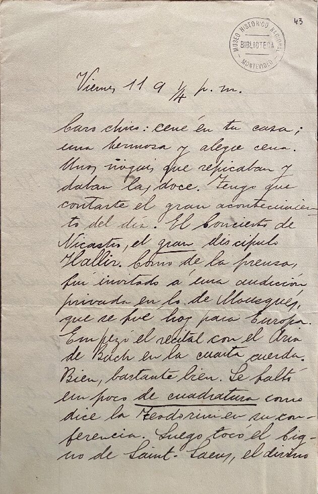Ver documentoCarta de César Cortinas a Camilo hijo, sin fecha. Hace referencia a aprendizaje de piano de Luisa Giucci. Ubicación: Museo Histórico Nacional.