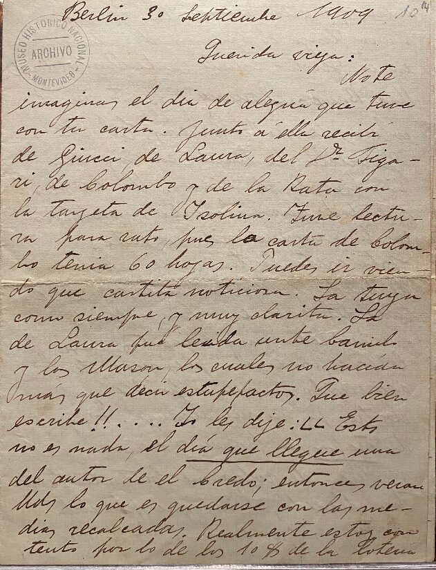 Ver documentoCarta de César Cortinas a sus padres, 30/9/1909. Menciona sus estudios en Europa y refiere haber recibido cartas de Camilo Giucci (padre). Ubicación: Museo Histórico Nacional.