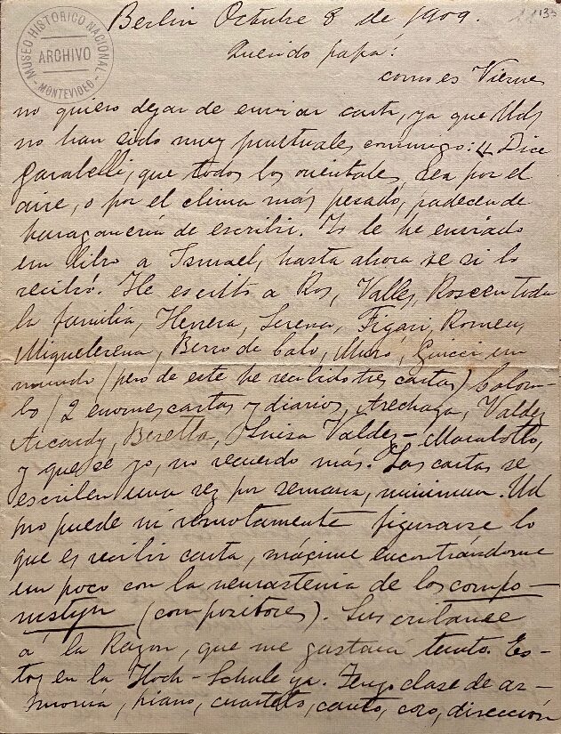 Ver documentoCarta de César Cortinas a sus padres, 9/10/1909. Habla sobre las cartas recibidas por Camilo Giucci (padre), y refiere a Camilo Giucci (hijo). Ubicación: Museo Histórico Nacional.