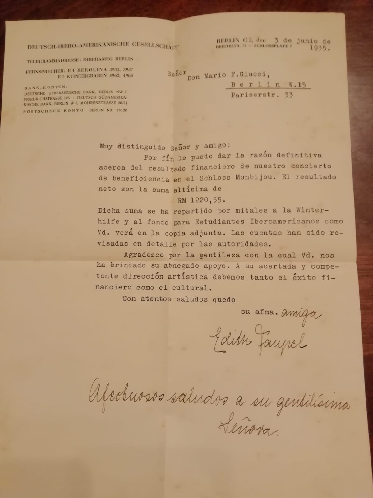 Carta de Edith Faupel a Mario Giucci, 3/6/1935. Le informa sobre resultados financieros de un concierto de beneficiencia en el Schloss Monbijou. El dinero iba a ser repartido en mitades entre la «Winterhilfe» y el fondo de «Estudiantes Iberoamericanos». Ubicación: archivo personal familia Giucci.