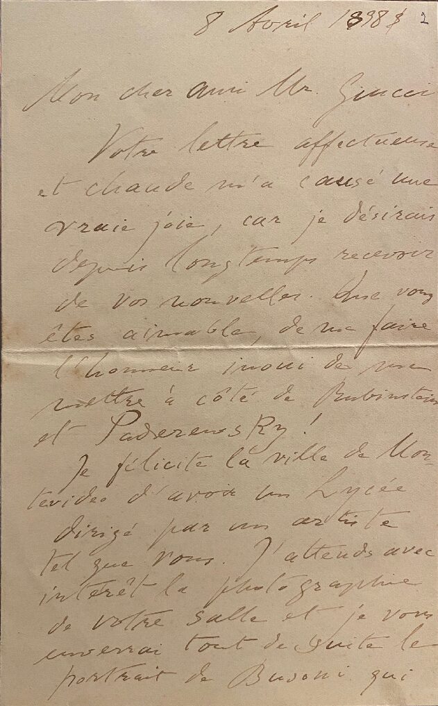 Ver documentoCarta de José Vianna da Motta a Camilo Giucci, 8/4/1898. En francés. Ubicación: Museo Histórico Nacional.
