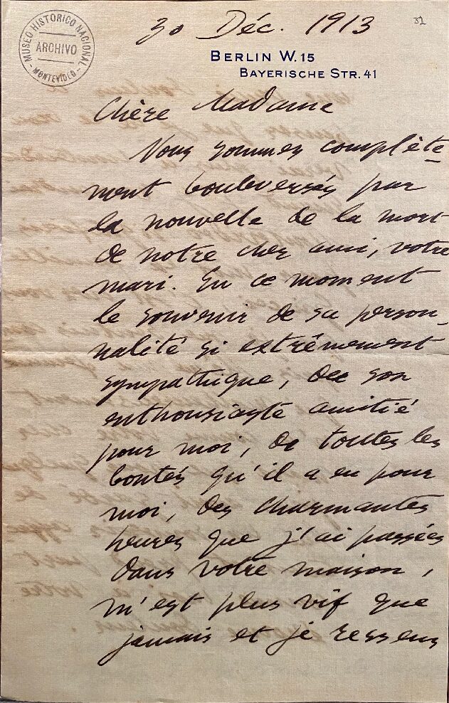 Ver documentoCarta de José Vianna da Motta a Luisa Gallo, 30/12/1913. Envía condolencias por el fallecimiento de Camilo Giucci (padre). En francés. Ubicación: Museo Histórico Nacional.
