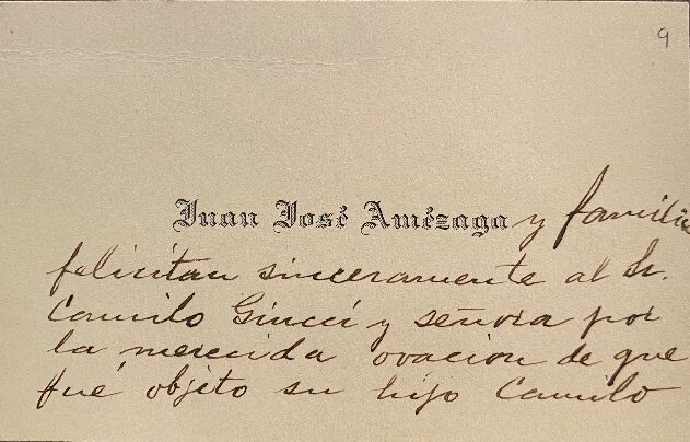Ver documentoCarta de Juan José Amézaga y familia a Camilo Giucci (hijo), 30/11/1908. Felicitan a Camilo por la obtención de la beca de estudios en Europa. Ubicación: Museo Histórico Nacional.