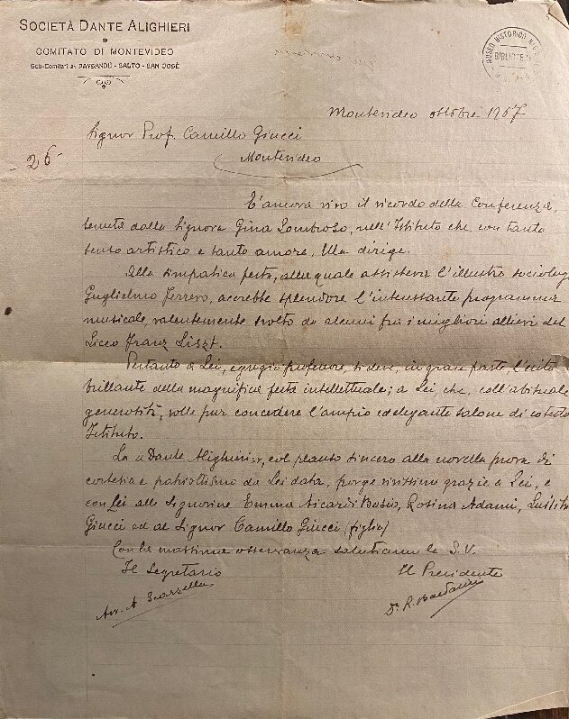 Ver documentoCarta de la Societá Dante Alighieri a Camilo Giucci (padre), 10/1907. En italiano. Ubicación: Museo Histórico Nacional.