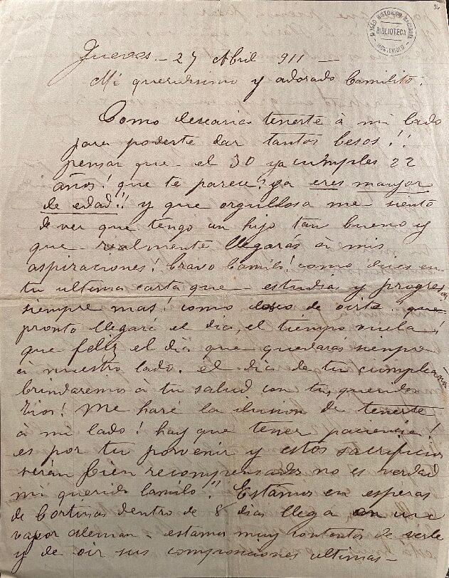 Ver documentoCarta de Luisa Gallo a Camilo (hijo), 24/4/1911. Refiere a avances en los estudios musicales de los distintos hijos. Ubicación: Museo Histórico Nacional.