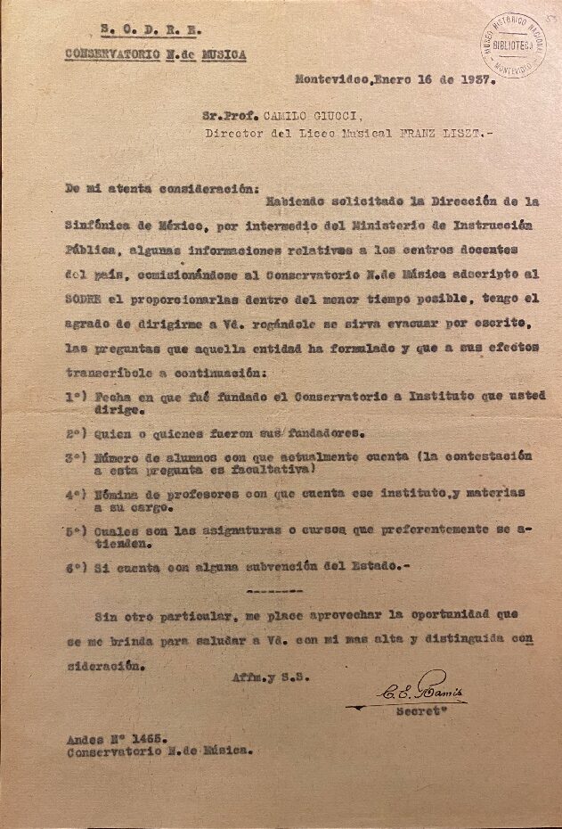 Ver documentoCarta del SODRE a Camilo Giucci (hijo), 16/1/1937, solicitándole información sobre el Liceo Musical Franz Liszt para enviar a la Dirección de la Sinfónica de México. Ubicación: Museo Histórico Nacional.