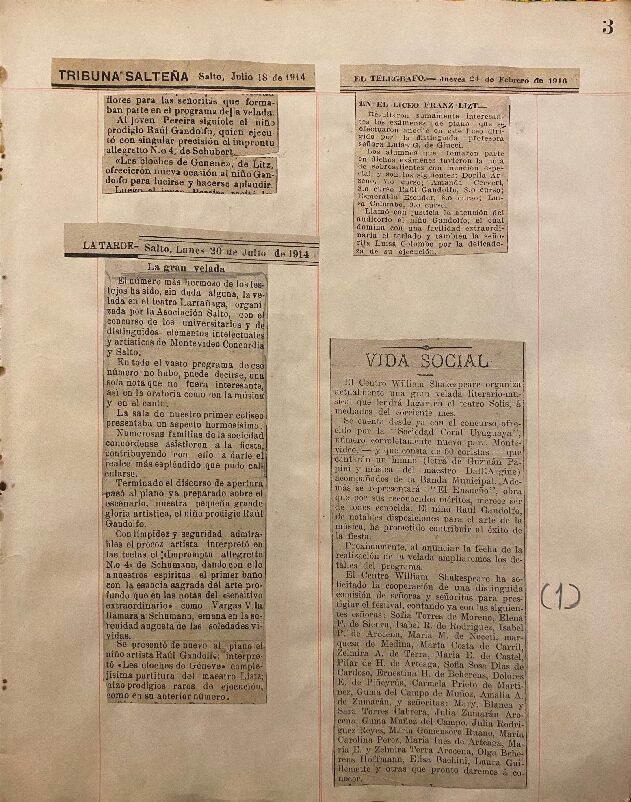 Ver documentoCuaderno de recortes de prensa de Raúl Gandolfo, con varias notas sobre conciertos de Mario Giucci y Gandolfo en el interior del país, 1914-1927. Ubicación: Archivo personal Mario Gandolfo.