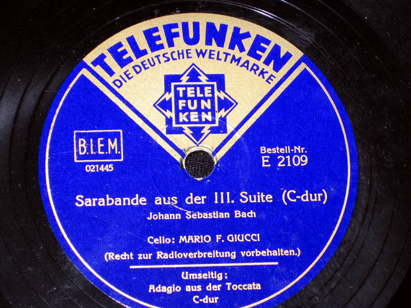 Ver documentoFoto de disco de grabación de Mario Giucci en compañía alemana Telefunken. «Sarabande aus der III. Suite» de Johann Sebastian Bach. No se cuenta con la grabación.