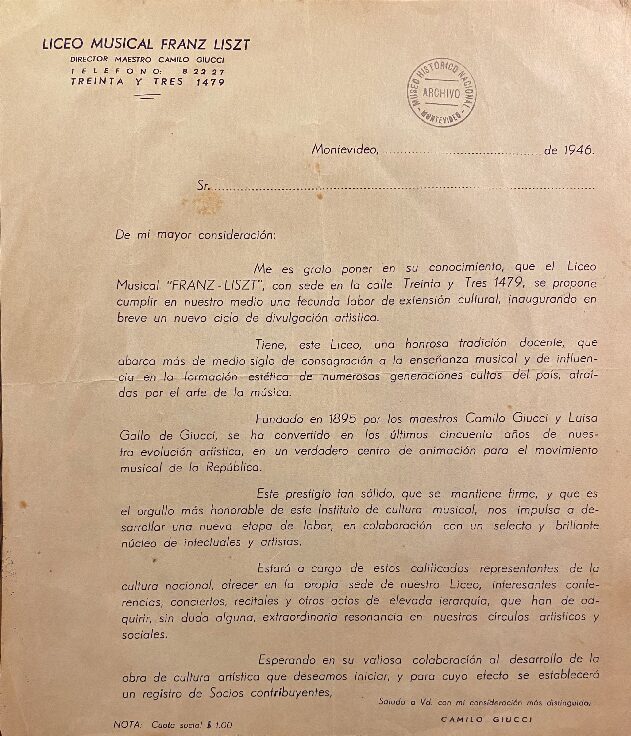 Ver documentoModelo de nota del Liceo Musical Franz Liszt, firmada por Camilo Giucci (hijo), pidiendo nuevas adhesiones para sustentar las actividades del Liceo, 1946. Ubicación: Museo Histórico Nacional.