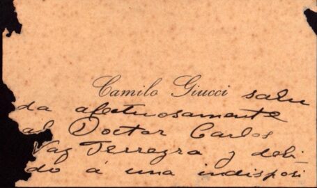 Ver documentoNota de Camilo Giucci (hijo), dirigida a Carlos Vaz Ferreira, sin fecha. Camilo se excusa por no poder concurrir a un homenaje a Vaz Ferreira. Ubicación: Museo Histórico Nacional.