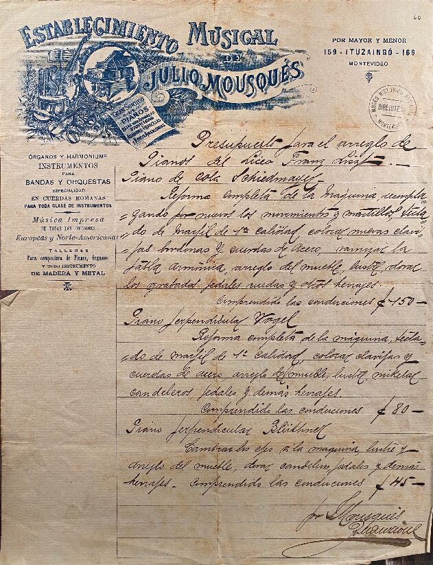 Ver documentoPresupuesto de Julio Mousqués, sin fecha. Corresponde al arreglo de pianos del Liceo Musical Franz Liszt. Ubicación: Museo Histórico Nacional.