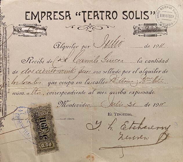 Ver documentoRecibo de alquiler de local en Teatro Solís del Liceo Musical Franz Liszt, 31/7/1911. Ubicación: Museo Histórico Nacional.