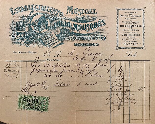 Ver documentoRecibo de Julio Mousqués, por $100 abonados por Camilo Giucci (padre), por arreglo de un piano. Fechado el 31/7/1907. Ubicación: Museo Histórico Nacional.