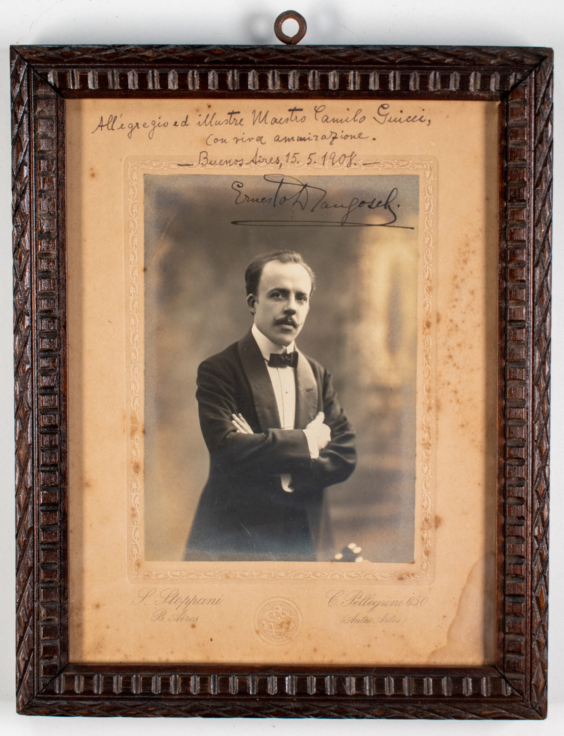 Ver fotografíaRetrato fotográfico de Ernesto Drangosch, con dedicatoria manuscrita a Camilo Giucci (padre), 15/5/1908. Ubicación: Museo Histórico Nacional.